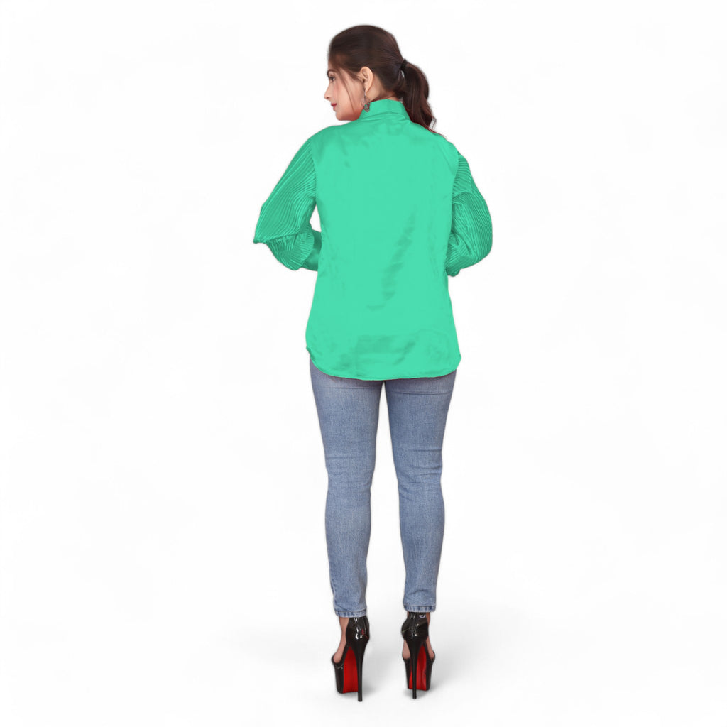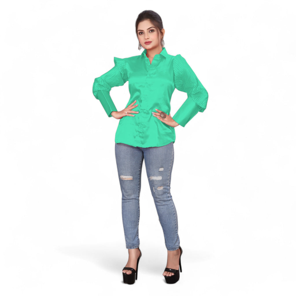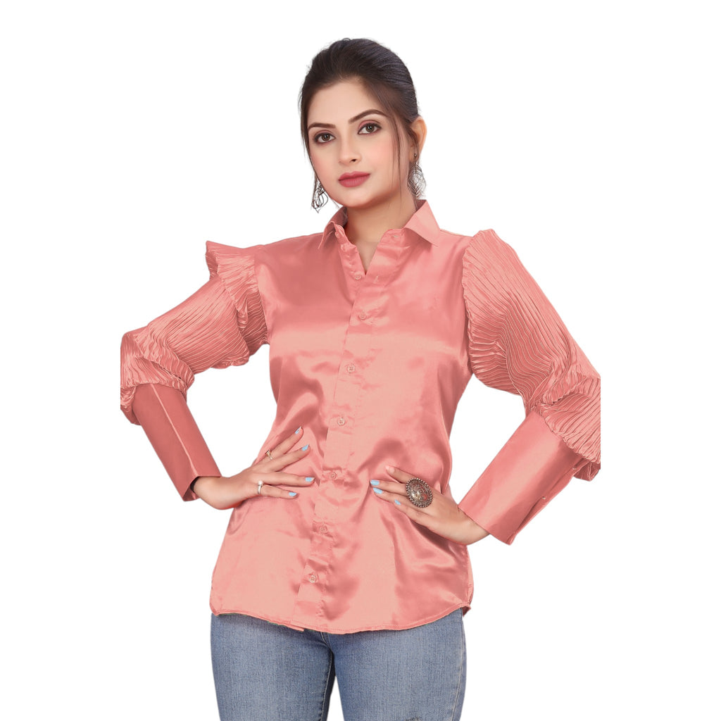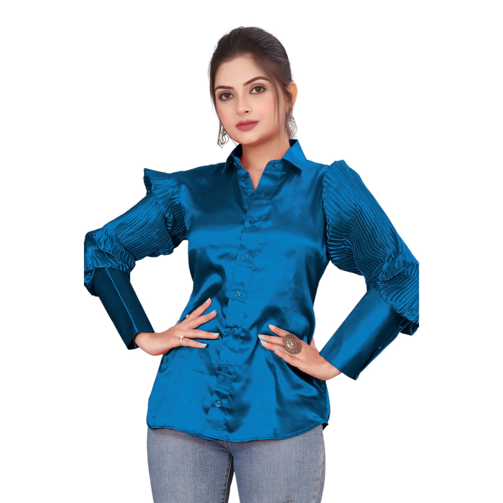 Crafted with elegance and sophistication, the Satin Button Down Shirt  adds a touch of flair to any outfit. The luxurious satin fabric and plated sleeve detail elevate this classic button down to a statement piece. Experience effortless style and comfort with this must-have wardrobe essential.