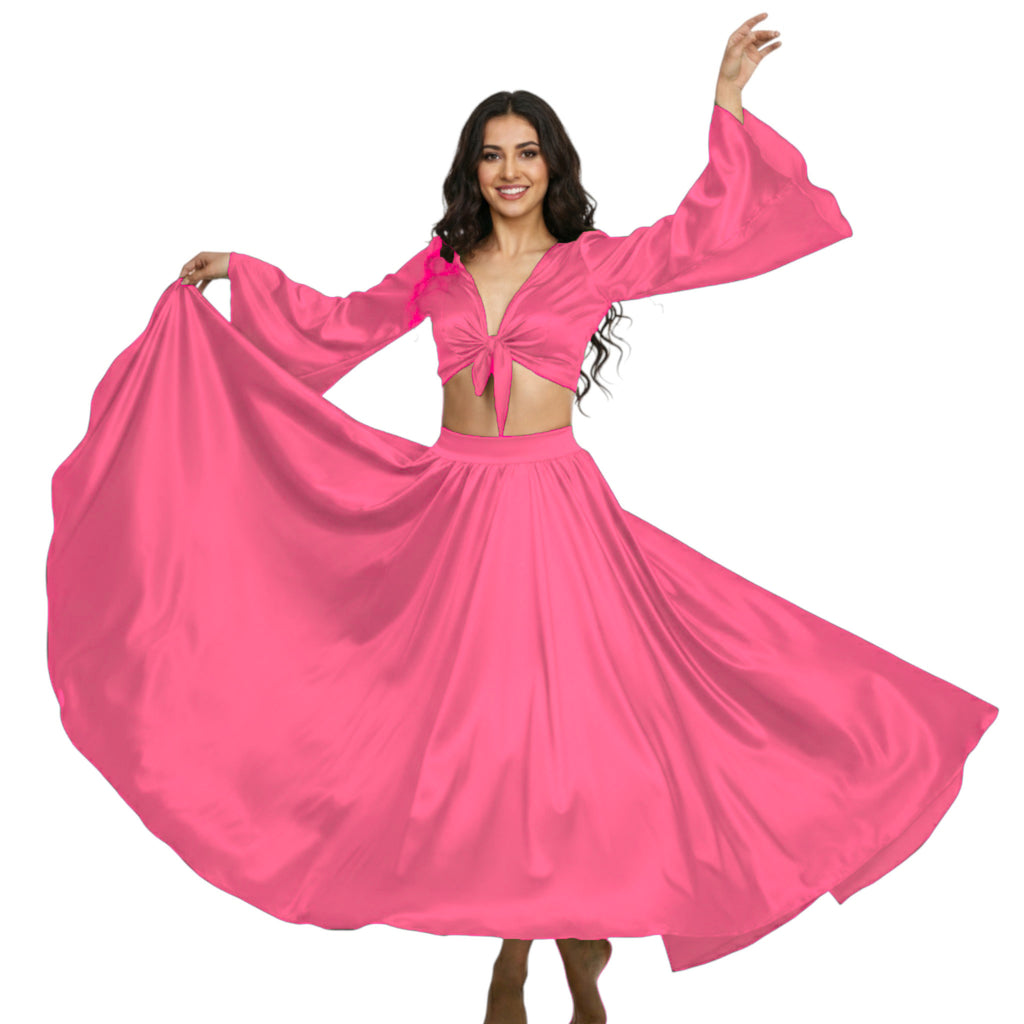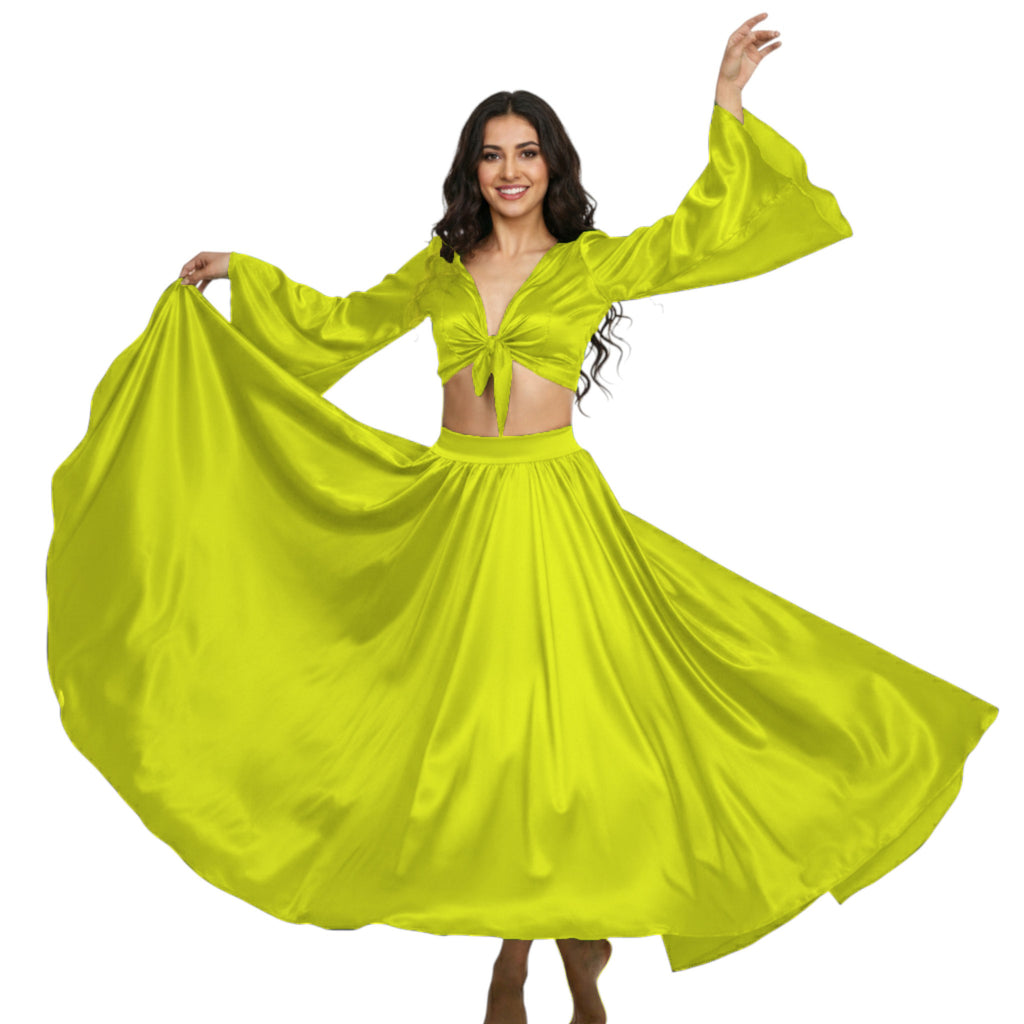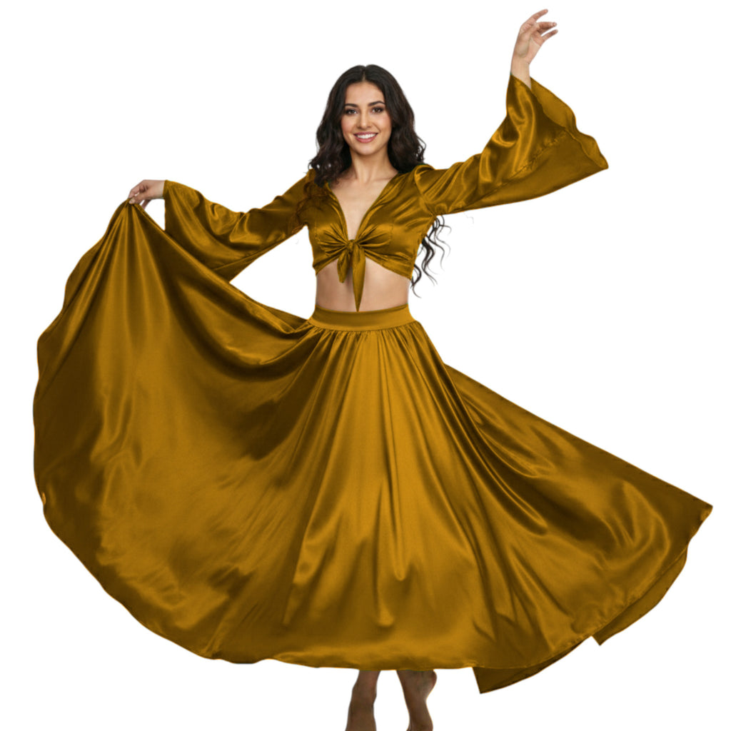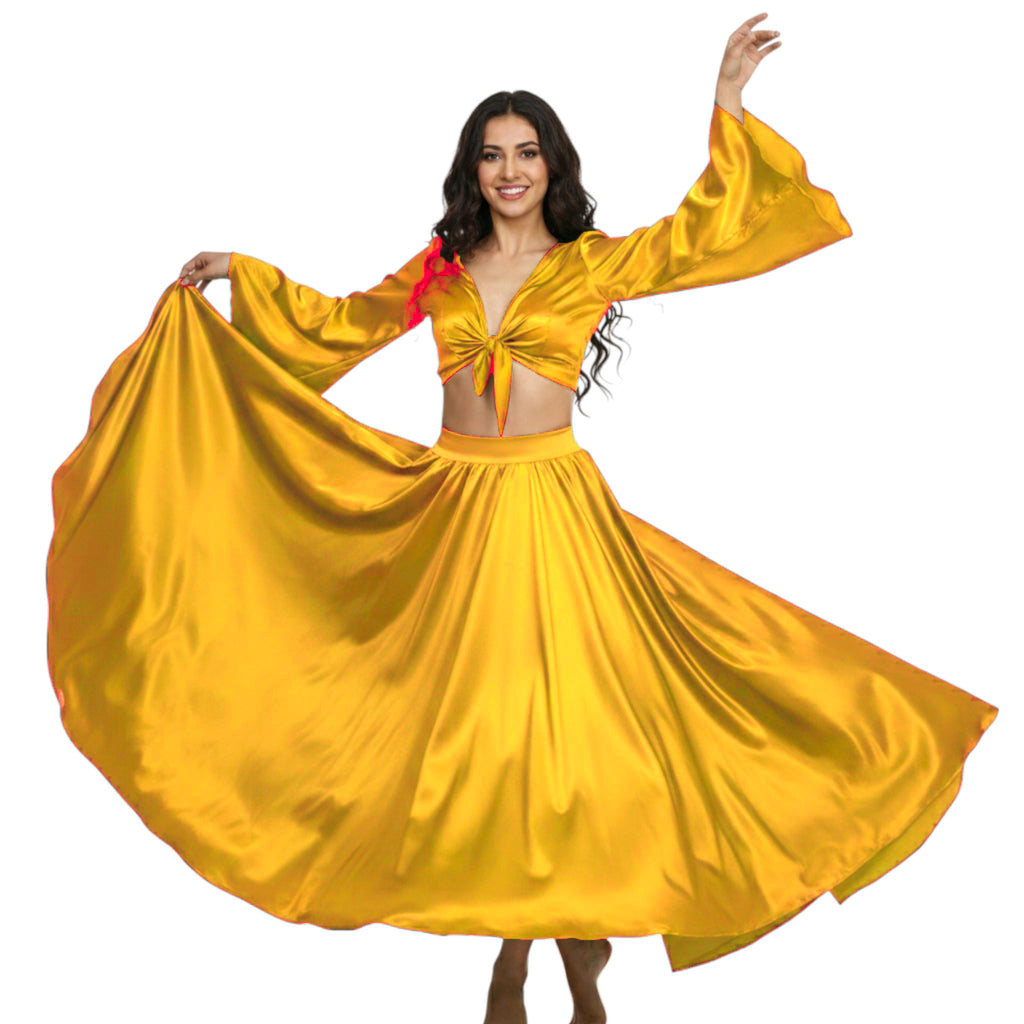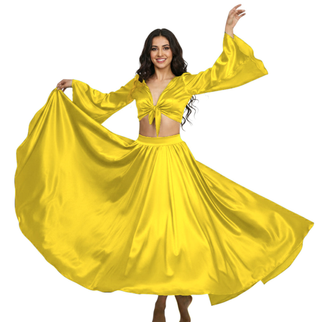 Dazzle your audience with our complete, high-impact Satin Belly Dance Full Circle Skirt and Ruffle Top Set. This matching two-piece costume is crafted from luxurious, high-shine satin, ensuring maximum visual effect and brilliance under stage lights.