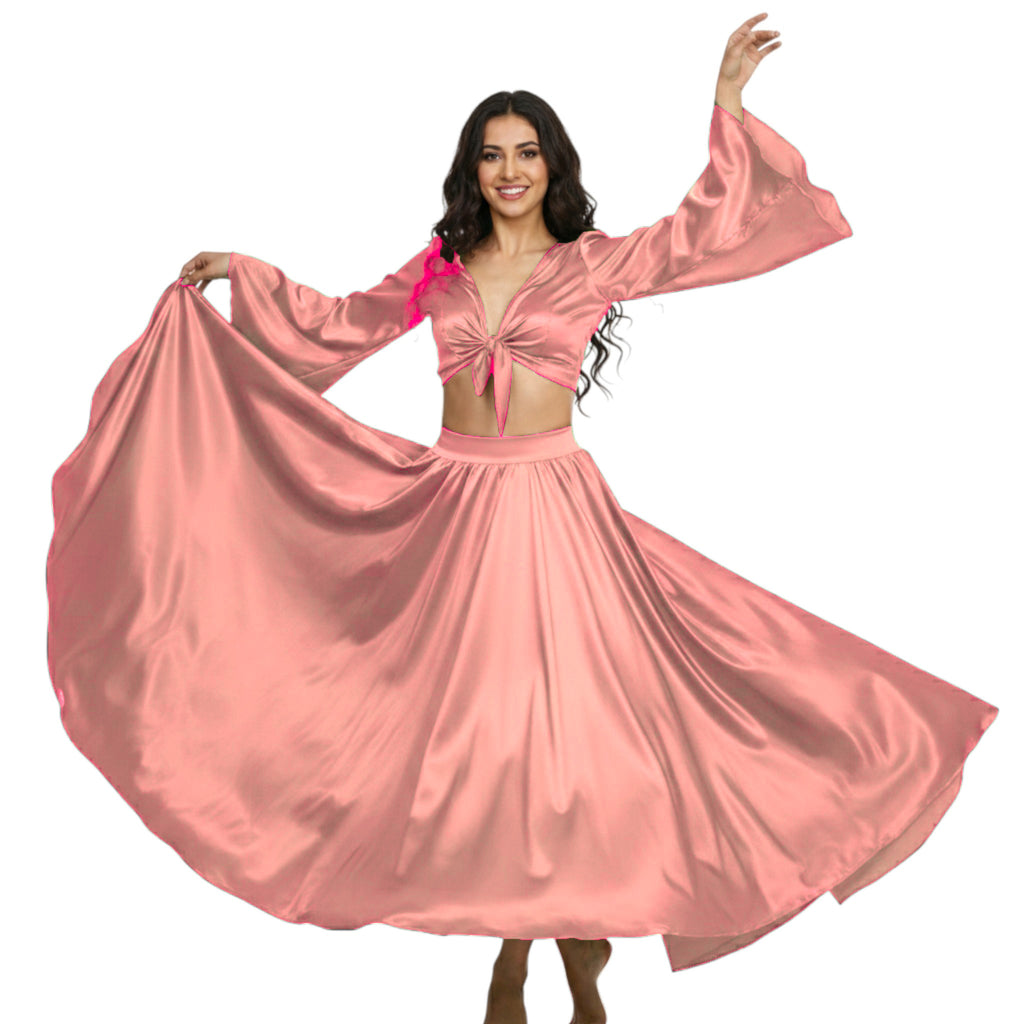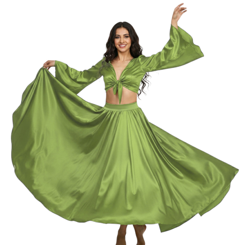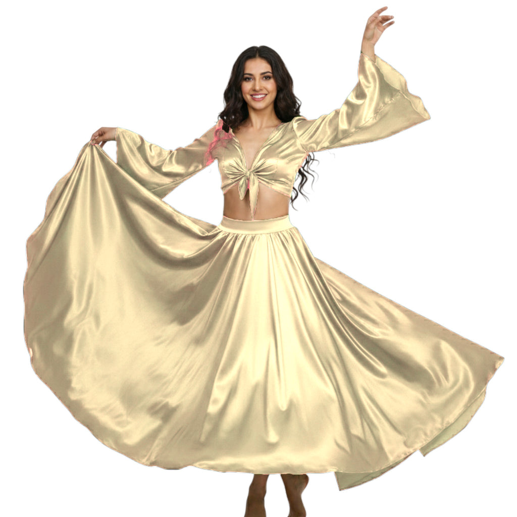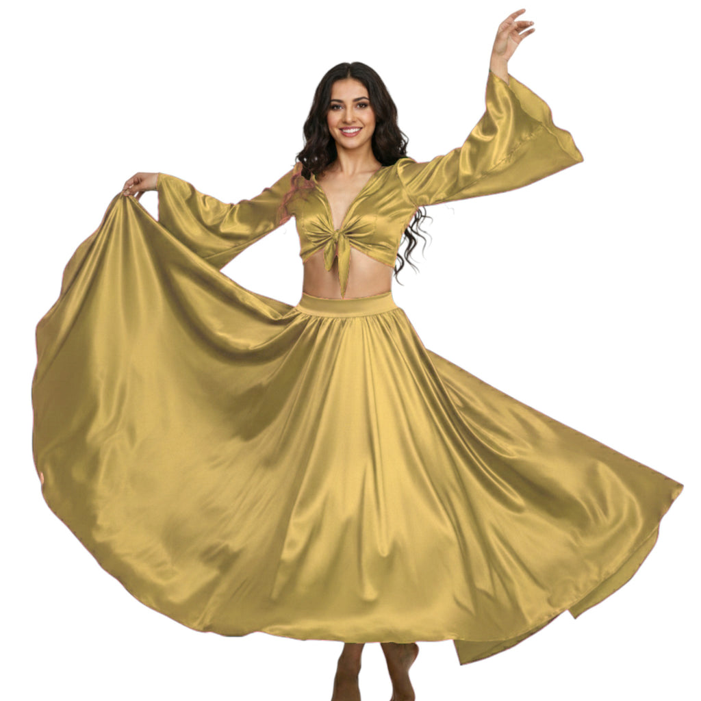 Dazzle your audience with our complete, high-impact Satin Belly Dance Full Circle Skirt and Ruffle Top Set. This matching two-piece costume is crafted from luxurious, high-shine satin, ensuring maximum visual effect and brilliance under stage lights.