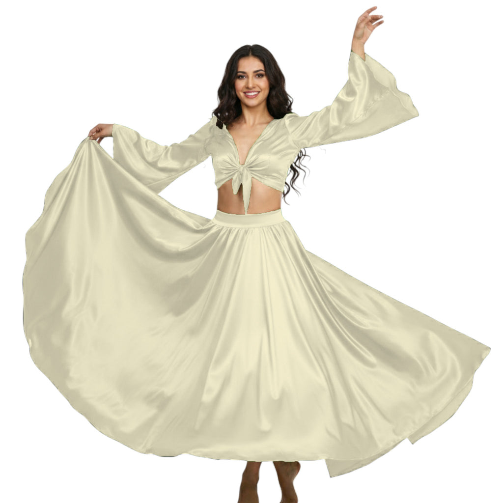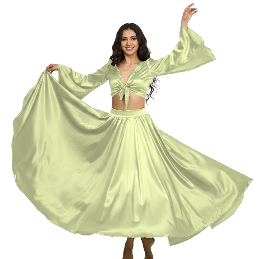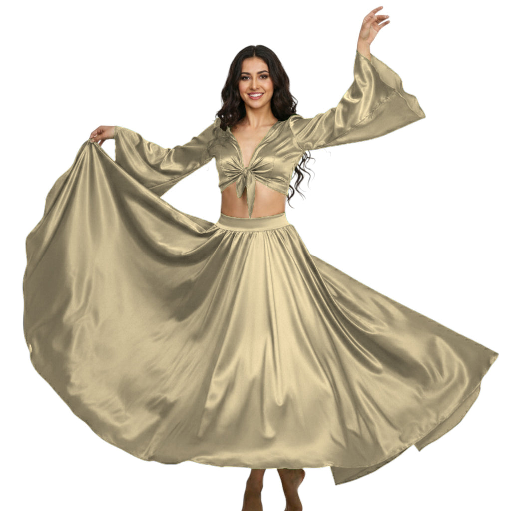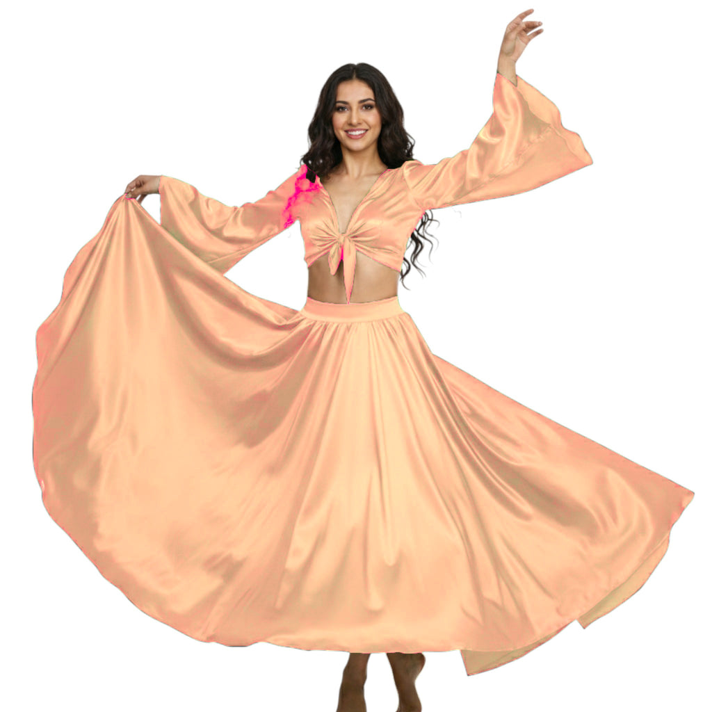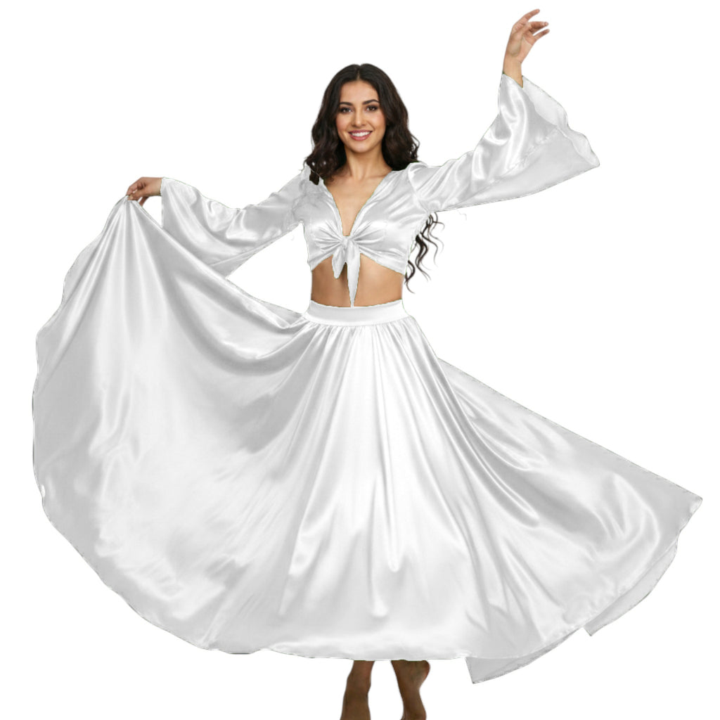 Dazzle your audience with our complete, high-impact Satin Belly Dance Full Circle Skirt and Ruffle Top Set. This matching two-piece costume is crafted from luxurious, high-shine satin, ensuring maximum visual effect and brilliance under stage lights.